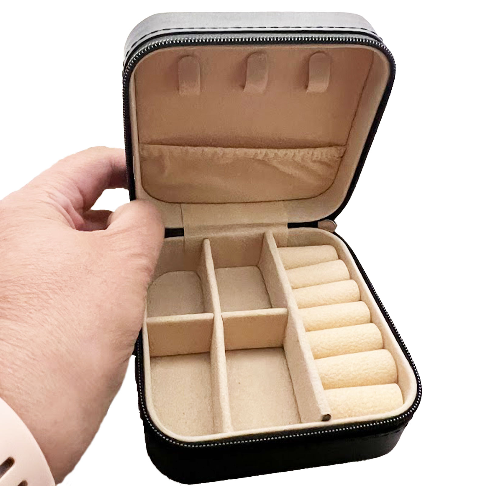 - Smart Storage: Features 3 lid hooks with a pouch for chains, plus a base with 4 compartments (approx. 30mm x 40mm) and a dedicated ring row (approx. 30mm x 90mm).