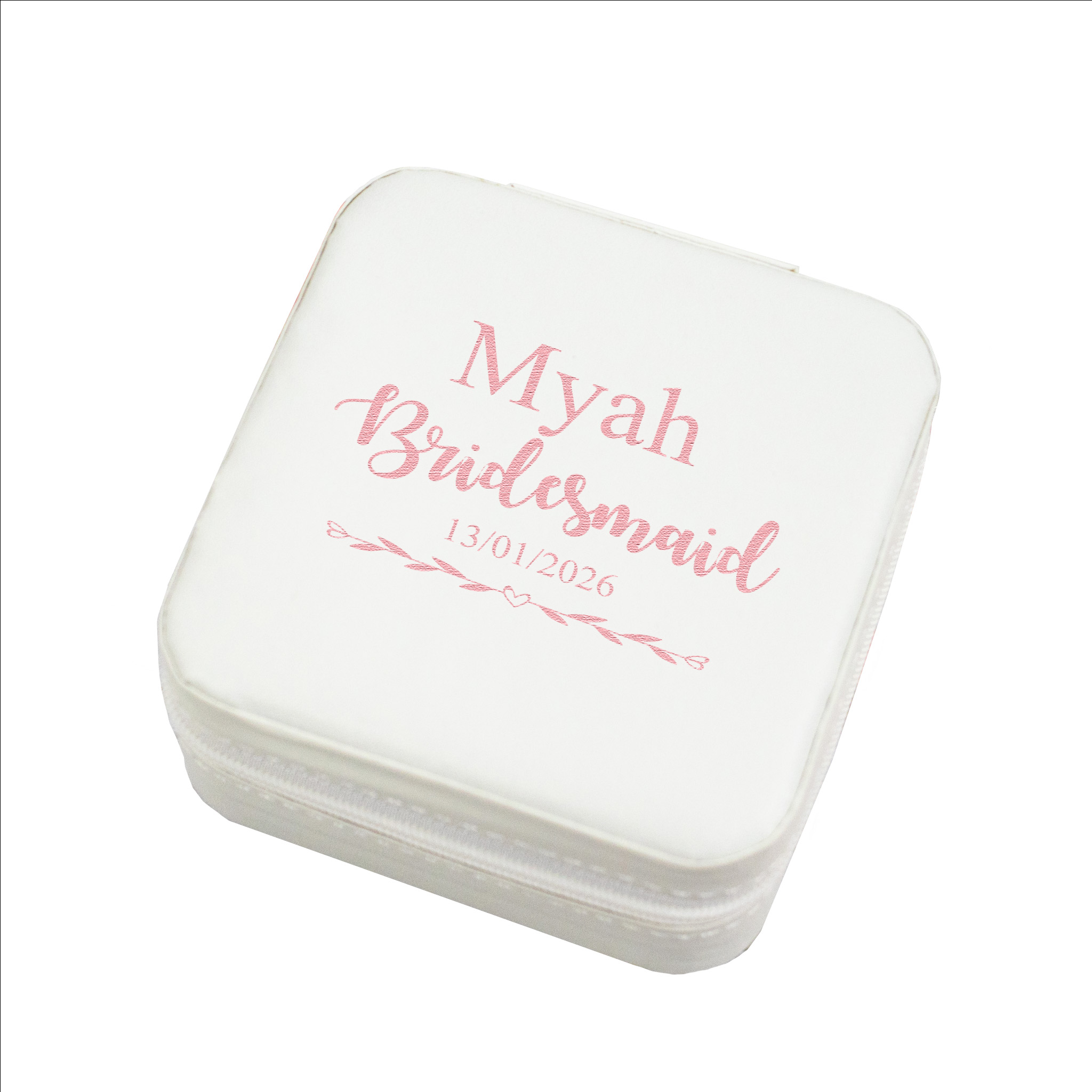 This cute, soft cream case is perfectly sized for travel and customised using our advanced UV printing technology, which delivers vivid, detailed visual imagery that lasts. By default, we print the name and date in a lovely soft pink to complement the cream finish. Creating a timeless look. Inside, the thoughtful design ensures their treasures stay organised; the lid features hooks and a pouch for chains, while the base offers compartments and a row of rings to keep every earring and band secure. It is a little luxury that says “thank you” in the most practical and heartfelt way.
