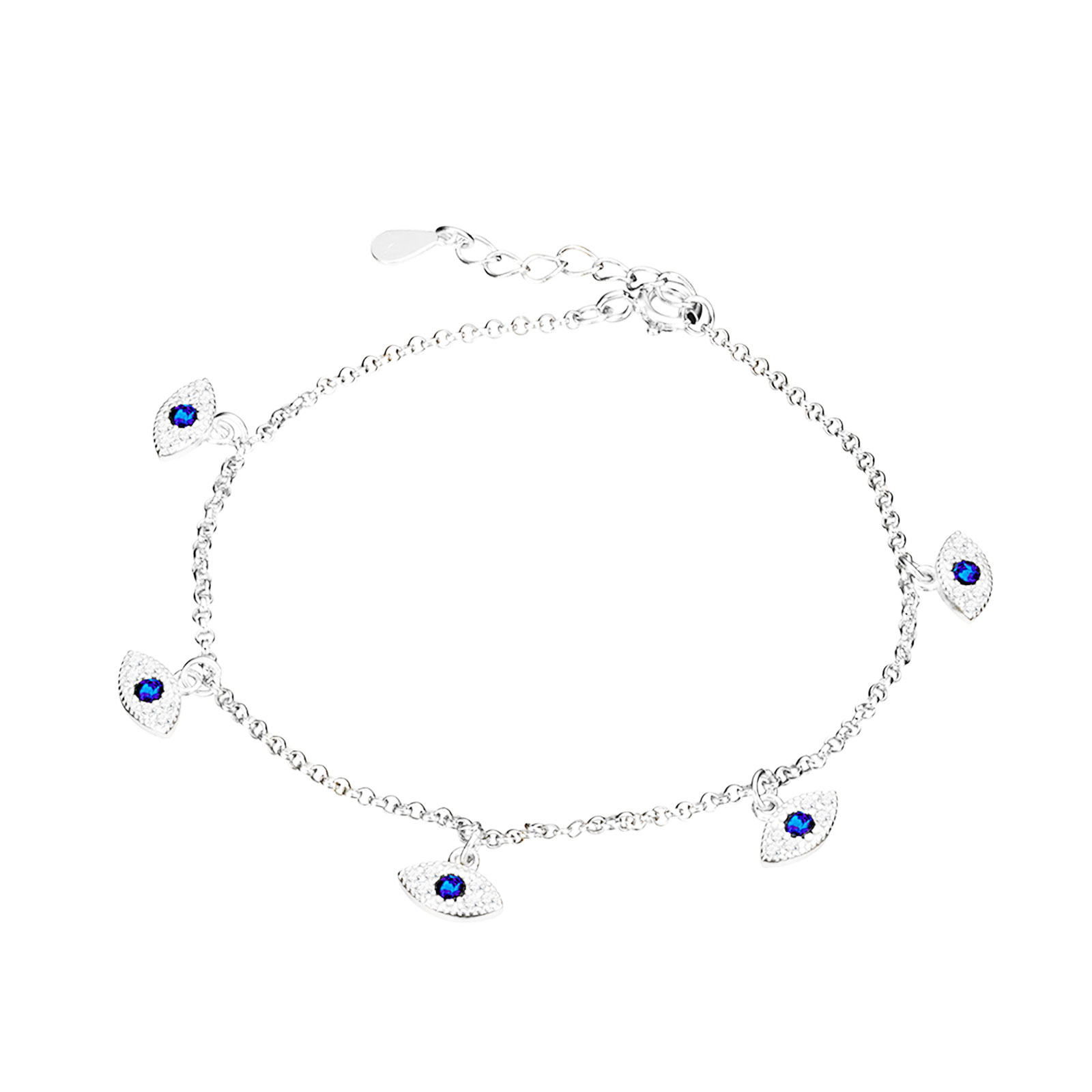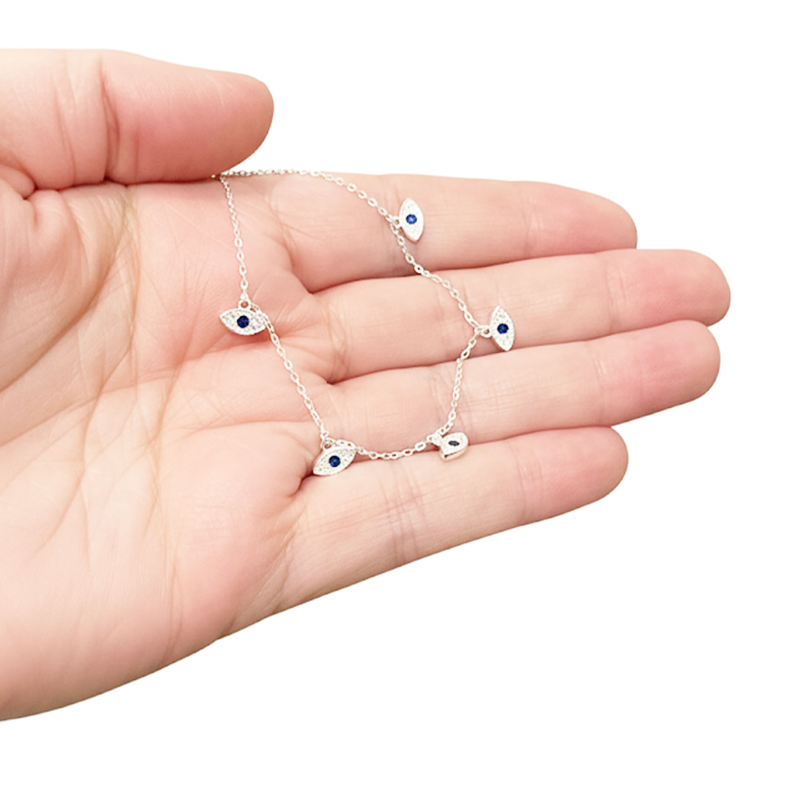 - Design: 5 x Fixed Evil Eye Charms (8x5mm) with bright blue crystal centres.