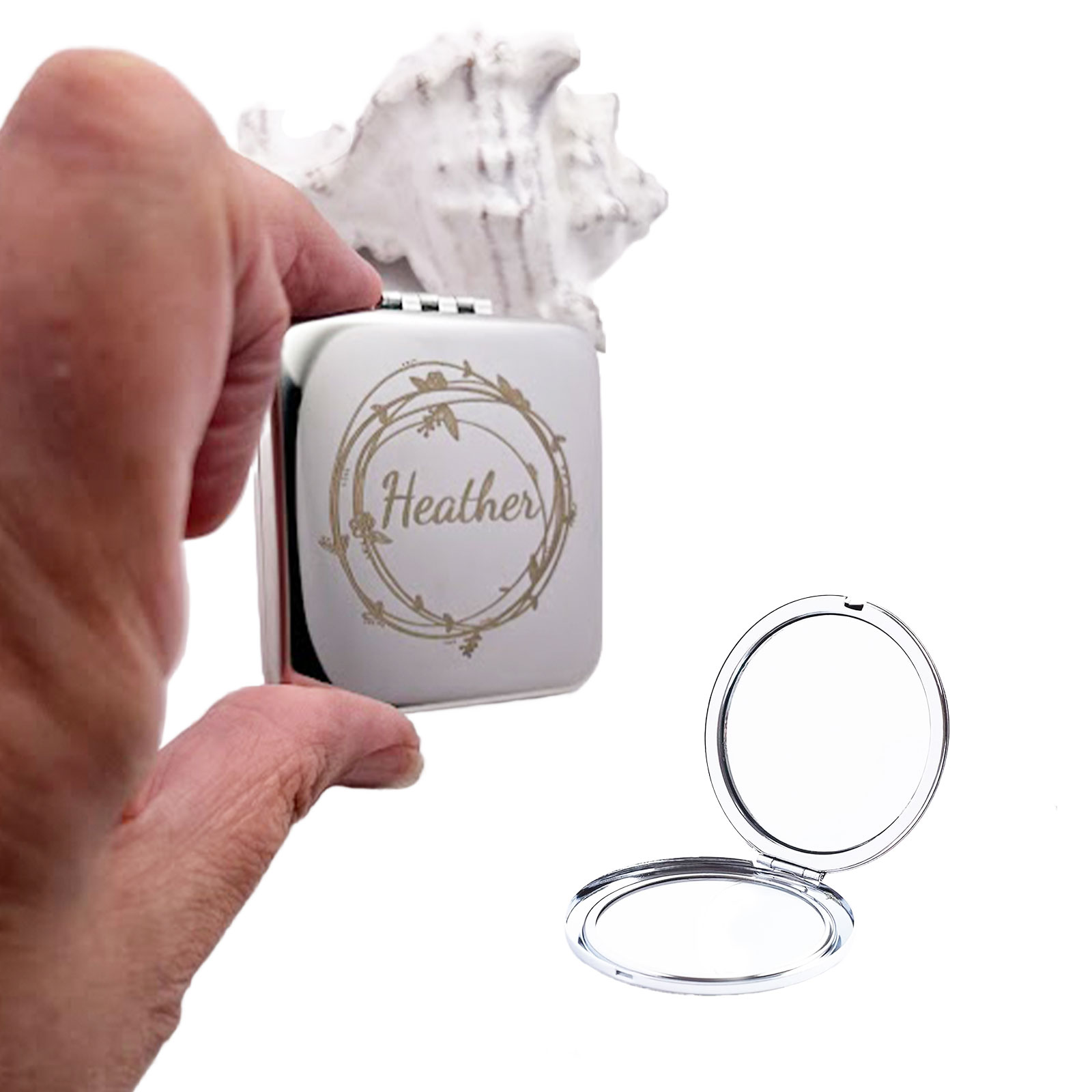 Crafted from high-quality stainless steel, this mirror feels substantial in your hand, weighing over 60 grams as a testament to its durability. You can choose between a classic 65mm Round shape or a modern 58mm Square design, both of which open to reveal two crystal-clear mirrors—one on the inner lid and one on the base—for perfect clarity. To make it truly yours, we use our precise on-site laser engraving technology to etch a name or a meaningful quote onto the surface. It is the perfect gift for a friend, a family member, or a well-deserved treat for yourself.