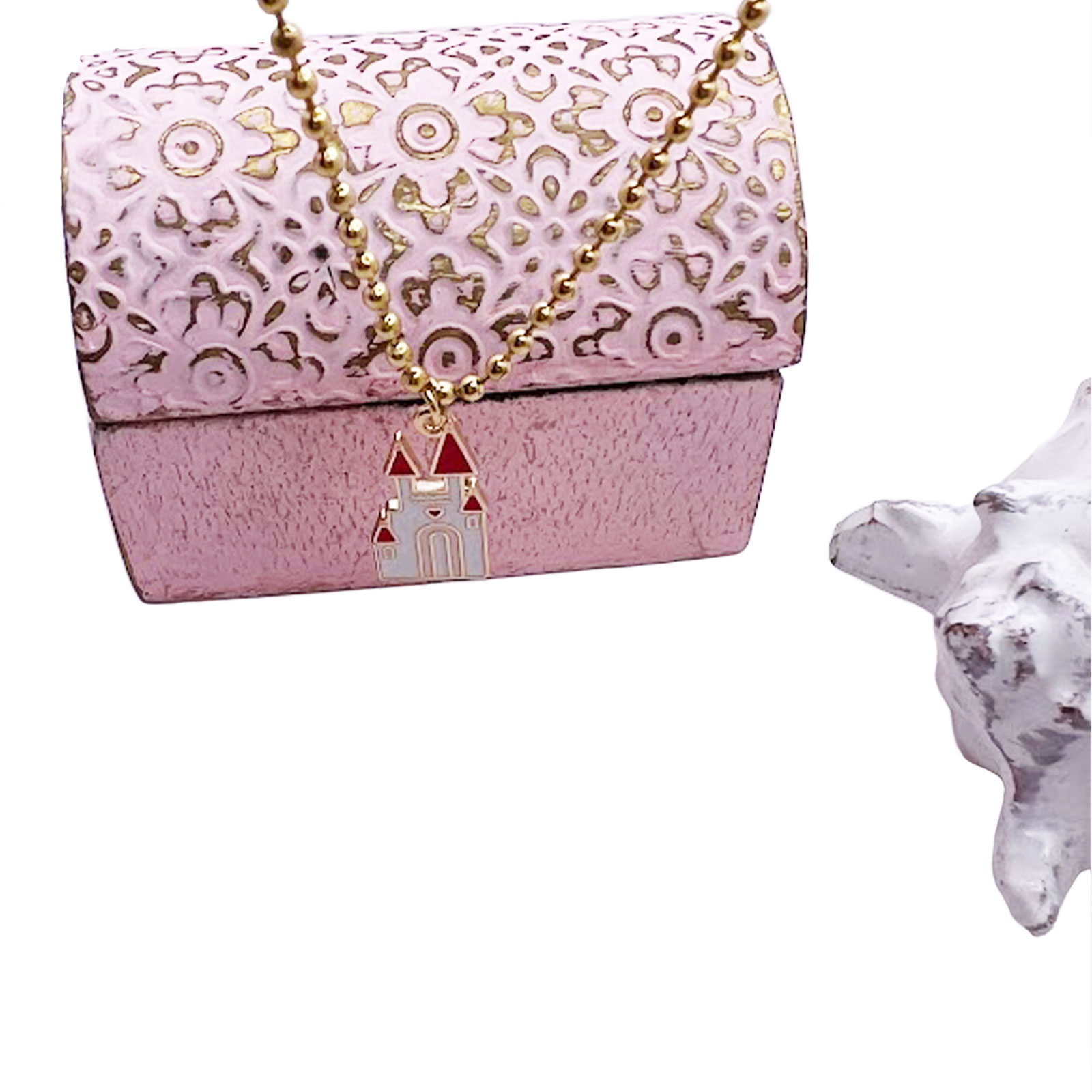This regal castle is brought to life with a radiant enamel coating in classic white and royal red, capturing a timeless storybook romance. Framed with an elegant gold trim, its intricate design feels both magical and sophisticated. Paired with a glowing gold-tone surgical steel chain, this necklace offers enduring beauty and a warm lustre, resting comfortably against your skin as a lasting talisman of your own happily ever after.